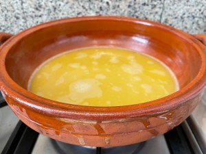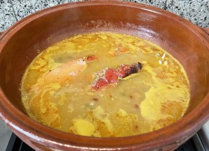 Mientras vamos haciendo el sofrito poner una cazuela honda de barro con el caldo a calentar.