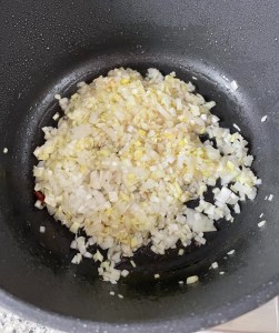 Picar muy fina la cebolla y el puerro. Añadir a lo olla donde hemos sofrito el pato. 15 minutos con el fuego al mínimo, tapado. Añadir una pizca de sal. Mover de vez en cuando para que no se queme.