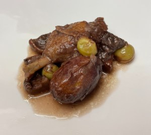 Añadir las setas limpias y troceadas. Dejar 5 minutos y por último añadir las ciruelas y uvas enteras. Otros 5 minutos, apagar el fuego y dejar que repose un rato. Si utilizáis ciruelas secas añadirlas a la vez que las setas.