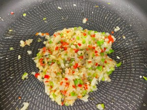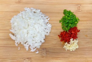 Picar la cebolleta, chiles y ajo. Si los chiles tienen semillas eliminarlas.