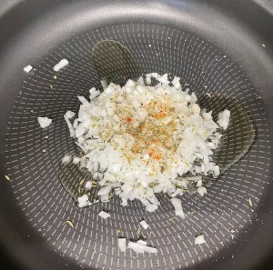 En una sartén con las 4 cucharadas de aceite poner la cebolla, orégano, comino, chile seco y una pizca de sal. 4 minutos a fuego medio.