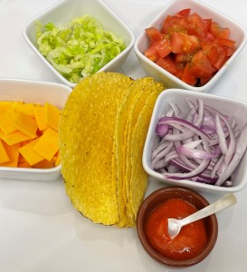 Servir cada cosa por separado para que cada comensal se prepare su propio taco: tortillas, carne, lechuga, tomate, cebolla, queso y salsa.