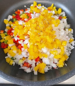 Cortar los pimientos y cebolla en daditos. Poner en una sartén con 4 cucharadas de aceite. Salpimentar. 5 minutos a fuego medio.