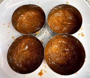 Sacar el molde de la nevera. Colocar encima una capa de dulce de leche.