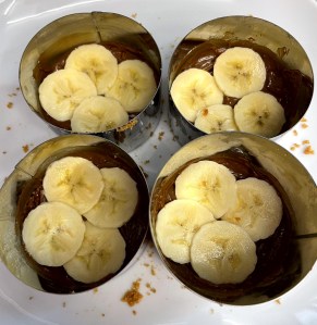 Sobre el dulce de leche poner unas rodajas de plátano. Quitar los moldes con cuidado y cubrir con la crema de nata y queso.