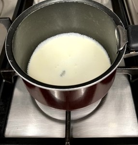 Calentar la nata con el azúcar y en cuanto vaya a comenzar a hervir sacar del fuego y dejar templar 2 minutos.