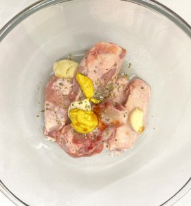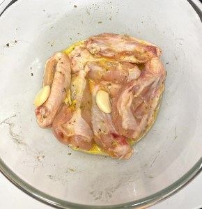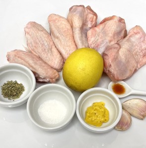 Poner en un bol las alitas con los ajos, zumo del limón, azúcar, mostaza y orégano.