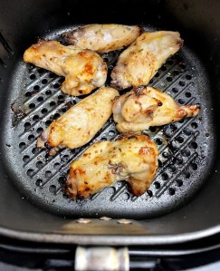 Poner dos pulverizaciones de aceite en el cestillo ( o con un papel de cocina untar un poco de aceite en la base ) y colocar las alitas. Otras dos pulverizaciones de aceite. 8 minutos.