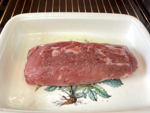 Calentar el horno a 220º arriba y abajo. Colocar el solomillo en una fuente de horno. Salpimentar. Poner las 6 cucharadas de aceite. Girar para que se impregne bien por todos los lados al igual que el fondo de la fuente.