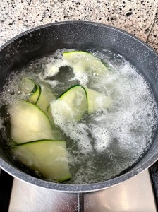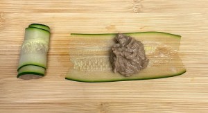 Cortar un calabacín por la mitad y con cada mitad hacer láminas con la mandolina o un cuchillo bien afilado.