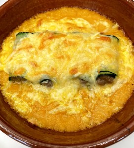 En una fuente de horno poner la crema de zanahoria. Colocar encima los canelones y espolvorear con el queso.