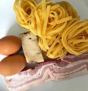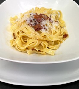 Normalmente cuando se piensa en salsa carbonara pensamos en una salsa hecha con nata, beicon e incluso champiñones. Esto es un error ya que la auténtica salsa carbonara no lleva nata ni por supuesto champiñones. Sus ingredientes son yema de huevo, queso pecorino y guanciale.