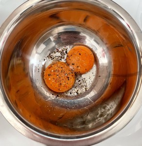 Separar las claras de las yemas. Colocar las yemas en un bol y guardar las claras para hacer un postre, tortilla…. Salpimentar.
