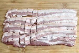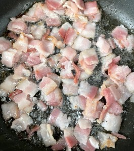 Cortar el beicon en tiras y dorar en una sartén. Reservar.