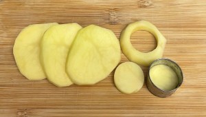 Pelar la patata, cortar en rodajas de un dedo de grosor y después con un cortapastas redondo pequeño hacer círculos. Poner en un cazo cubiertas de aceite y confitar. Fuego al mínimo, tapadas. Dejar hasta que estén tiernas al pincharlas. Tardan como unas 2 horas. Una manera mucho más rápida de hacerlas es cociéndolas. Es importante que estén tiernas pero no demasiado para que al cortarlas no se rompan. Si las vais a cocer ponerlas enteras con piel. Cuando estén bien cocidas, dejar enfriar, pelar y cortar con el cortapastas.