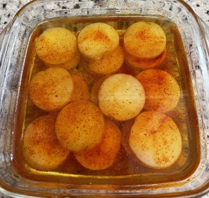 Dejar tanto el pulpo como las rodajas de patatas con pimentón y cubiertas de aceite. Macerar en la nevera de un día para otro.