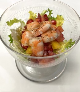 Para montar la ensalada poner en la base la escarola, encima el tomate, mango, granada y terminar con los langostinos. Regar con la vinagreta…. Y A COMER!!!!!