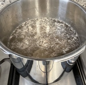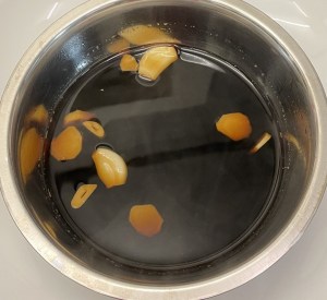 Pelar el ajo y cortarlo en rodajas. Cortar la misma cantidad de jengibre y añadir los dos al cazo.