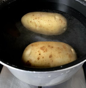 En una olla con agua y una pizca de sal hervir las patatas con piel. Dejarlas hasta que se pinchen con facilidad pero no demasiado o se nos romperán al cortarlas.