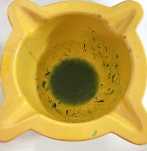 Como yo voy a hacer poquita cantidad voy a utilizar un truco. En un mortero poner el cebollino troceado. Majar bien. Añadir el AOVE, mezclar, dejar reposar un ratito y colar.