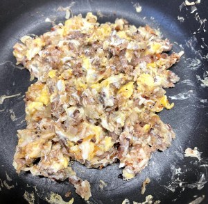 Cuando empiece a tomar color añadir la carne desmenuzada, tanto el pollo como la ternera. Rehogar a fuego vivo. Probar de sal. Apagar el fuego y añadir dos huevos. Remover bien para conseguir un revuelto muy jugoso. Con el calor que queda en la sartén es suficiente ya que sino se nos quedará muy seco.