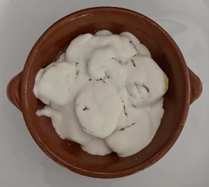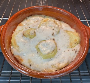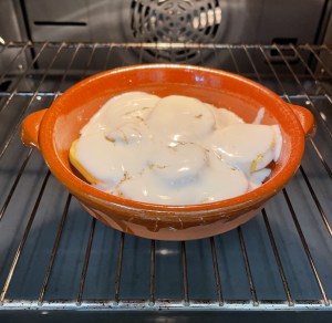 Vamos a hacer una ración individual en una cazuelita de barro pero de la misma manera, simplemente multiplicando los ingredientes por las raciones y utilizando una fuente de horno mayor, ya sea de barro o de cristal, la receta se hace de la misma manera.