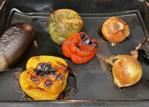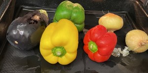 Lavar los pimientos y berenjena y meter en el horno junto con las cebollas. Colocar simplemente en la bandeja de horno sin añadir nada. 30 minutos.
