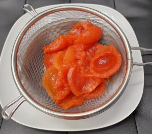 Pelar, quitar las semillas y cortar en gajos grandes. Dejar un rato escurriendo en un colador para que eliminen el agua que sueltan.