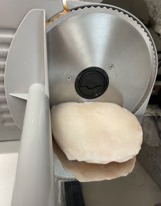 Sacar del congelador y cortar en pequeñas tiras. Lo ideal es utilizar una cortadora de fiambre pero sino tenéis emplear un cuchillo bien afilado y vuestra destreza.