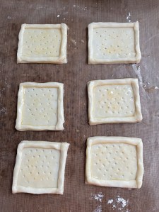 Extender la masa de hojaldre con una pizca de harina. Cortar en cuadrados y dejar un poco para hacer unas tiras finas. Poner estas tiras formando un borde. Pinchar el centro con un tenedor. Pintar con huevo batido. Meter en el horno precalentado a 220º, arriba y abajo, 5 minutos, hasta que se dore la masa.
