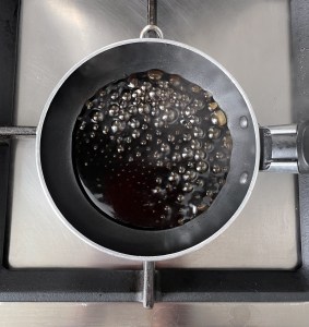 Hacer un glaseado poniendo en un cazo 1 parte de vinagre balsámico y ¼ parte de azúcar moreno. Fuego fuerte.