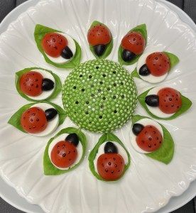 Para terminar hacer puntitos con un palillo bañado en el glaseado sobre los tomates simulando las manchas negras de las mariquitas.