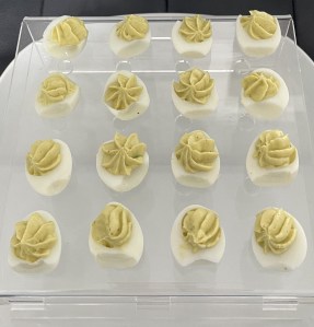 En el vaso de la batidora poner las yemas, aguacate, zumo de medio limón, 2 cucharadas de yogur, una pizca de sal y pimienta y 3 cucharadas de AOVE. Triturar. Poner en una manga pastelera. Rellenar las claras Y LISTO!!!!!
