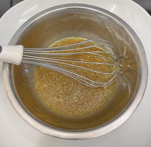 Para hacer la vinagreta poner en un bol el zumo de limón, la sal, pimienta y un poco de la marinada. Añadir el aceite, las variantes picadas y emulsionar con unas varillas.