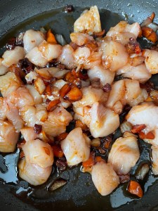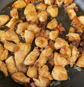 Cortar la pechuga a dados y añadir a la sartén ya con el fuego apagado. Mezclar bien y dejar una media hora para que el pollo macere.