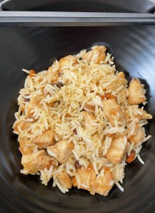 Ya solo nos queda acabar el plato en un momentito. Poner la sartén que contiene el pollo con el fuego al máximo. En cuanto el pollo cambie de color añadir el arroz, mezclar bien…..Y LISTO!!!!!