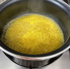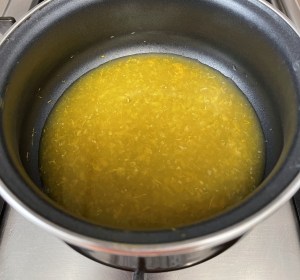 Poner en un cazo 100 g de zumo de mandarina sin colar y 10 g de azúcar.