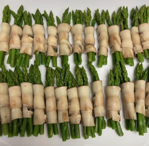 Envolver tres espárragos con dos champiñones. En la receta que os acabo de comentar os lo explico con detalle.