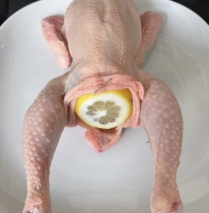 Salpimentar el pollo por fuera.