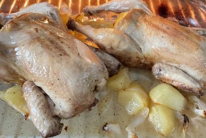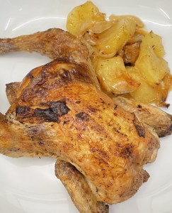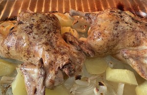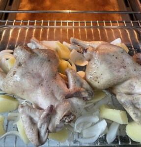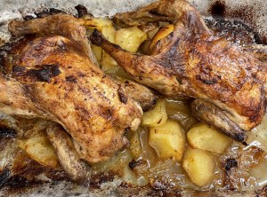 Sacar. Dar otra vez la vuelta a los pollos, mover las patatas y cebollas que se habrán quedado un poco pegadas a la fuente….