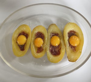 Vaciar con un sacabolas o una cucharita. La patata que vayáis vaciando la podéis utilizar por ejemplo para hacer una ensalada o ensaladilla.