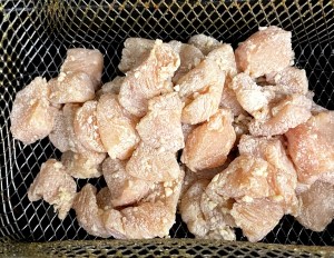 Rebozar con la maicena. Veréis que al rebozarlo se desprenden la mayoría del ajo y jengibre.