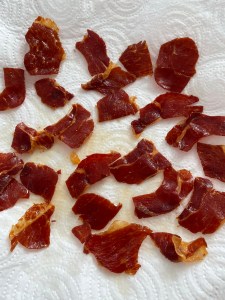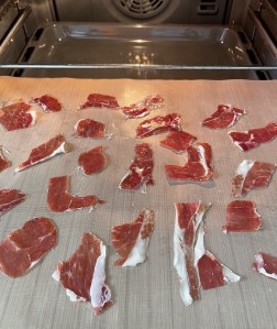 Cortar el jamón en trocitos y colocarlo en sobre una hoja de silpat o papel de horno. Meter en el horno precalentado a 220º, 10 minutos. Ir vigilándolo para que no se queme ya que depende del grosor del jamón el que se haga un poco antes o después.