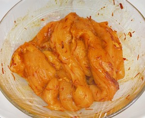 Cortar la pechuga en tiras. Colocar en un bol con la mezcla de especias. Remover bien, tapar con film y meter en la nevera un mínimo de 12 horas.