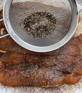 Sacar el pollo de la nevera. Extender en un plato y espolvorear con el alga triturada que habremos colocado en un colador de malla fina.