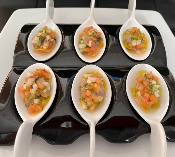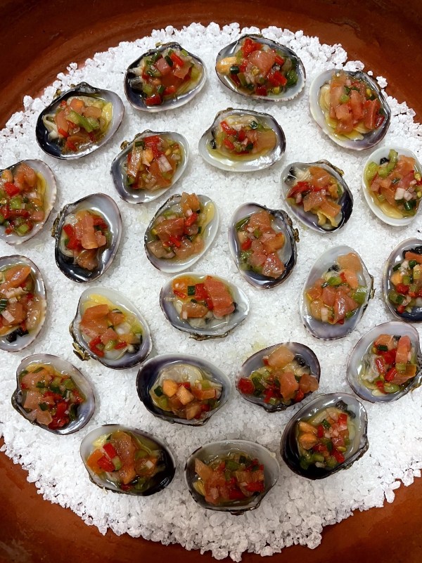 INGREDIENTES: 1 malla de almejas japonesas ( unas 30 unidades ) 1,5 hojas de gelatina 250 ml agua de almejas SALPICÓN: 1 cucharada de cebollino picado, 1 cucharada de chalotas picadas, 1 cucharada de pimiento verde y otra de pimiento rojo picados, 2 cucharadas de tomate raf a cuadraditos, 3 cucharadas de AOVE, 1 cucharada... Leer más →
