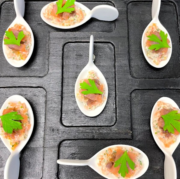 Un aperitivo facilísimo que se puede tener preparado con antelación. INGREDIENTES: 100 g salmón ahumado 1 cebolla morada pequeña 1 cucharada de queso philadelphia 1 cucharada de mayonesa 3 pepinillos en vinagre medianos 1 cucharada de perejil picado Unas hojas de perejil para decorar Aceite de oliva 0,4º Sal Picar la cebolla morada. Pochar en... Leer más →