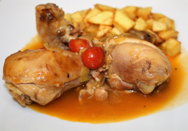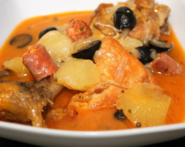 Pollo guisado con chistorra y aceitunas negras