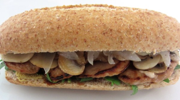 Bocadillo de pechuga de pollo marinada, cebolla caramelizada, champiñones y rúcula
