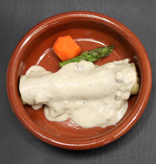 Canelones de tres carnes con salsa de setas shiitake acompañados de espárragos trigueros y zanahorias
